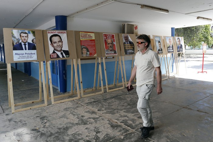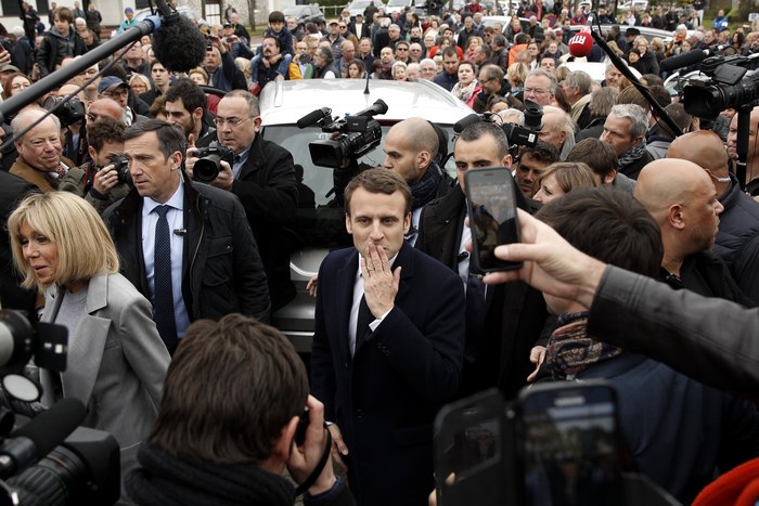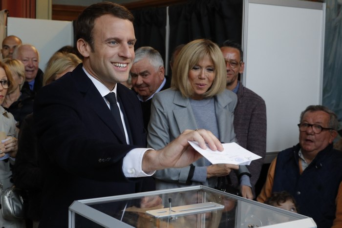 Големият фаворит за поста Емануел Макрон гласува в морския град Льо Туке.