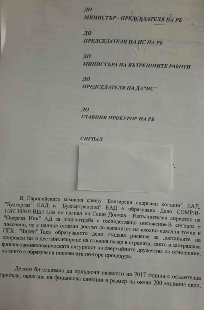 С думи прости - ако дружество по пътя на газа декларира фантомни разходи, това се калкулира върху крайната цена, а на държавния регулатор е отговорността да провери истинността на твърденията. Въпросният сигнал до Цацаров върши работата на контра срещу Сашо Дончев, който съди България в ЕК, и се появи в БГНЕС. Датата също съвпада със заявеното от прокуратурата - 16 януари.