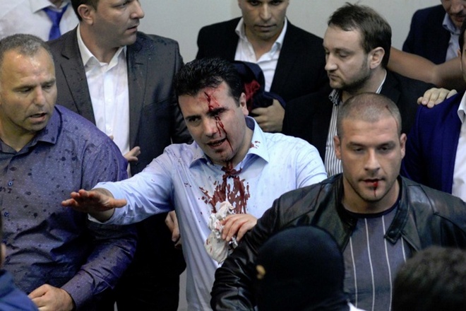 В живо тв предаване се видя окървавеното лице на Заев. Това става минути след като той се похвали пред журналисти с избора на новия председател на парламента. "За него гласуваха 61 депутати. Честито на г-н Талат Джафери и на добър час на всички нас", каза той. Малко по-късно протестиращи нахлуха в парламента.
