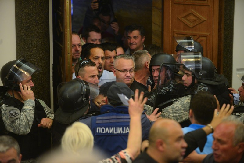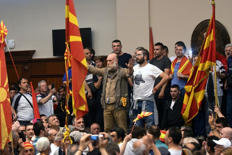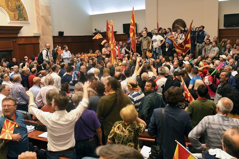 Тълпа от националисти, разярена от избора, е нахълтала минути след като той е станал факт в главната зала, съобщи агенцията. От разпространените кадри се вижда, че част от тях са маскирани, а всички носят националното знаме и отличителни знаци на управлявалата 10 години партия ВМРО-ДМНЕ на премиера Никола Груевски.