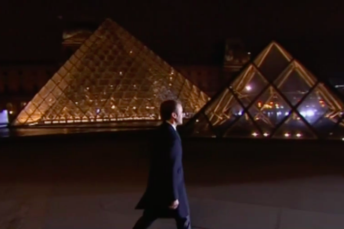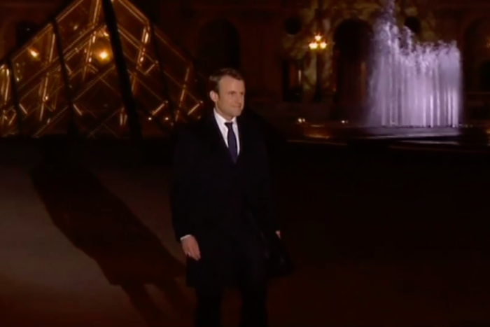 Сцената, която ще остане в историята от тази нощ на победата, е как Макрон влиза сам пеша в каменния двор на Лувъра под звуците на "Ода на радостта", химн на обединена Европа.