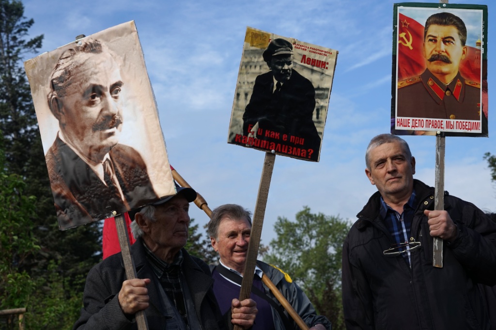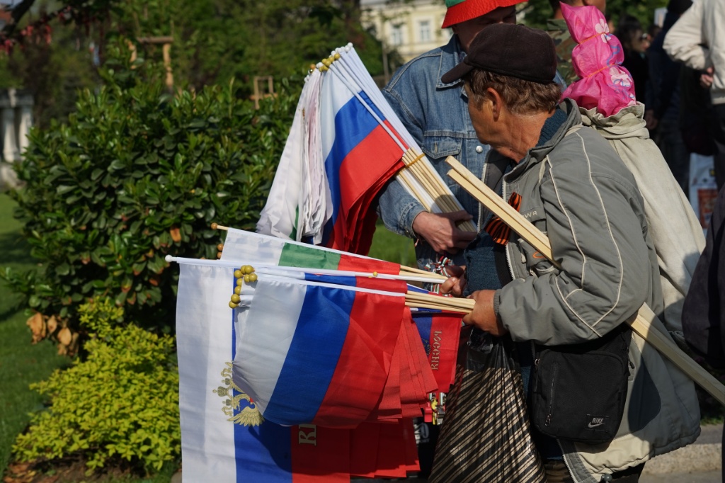 Събралите се носеха флагове на Русия, както и комунистически символи. Петолъчки, ликове на Ленин и Георги Димитров.