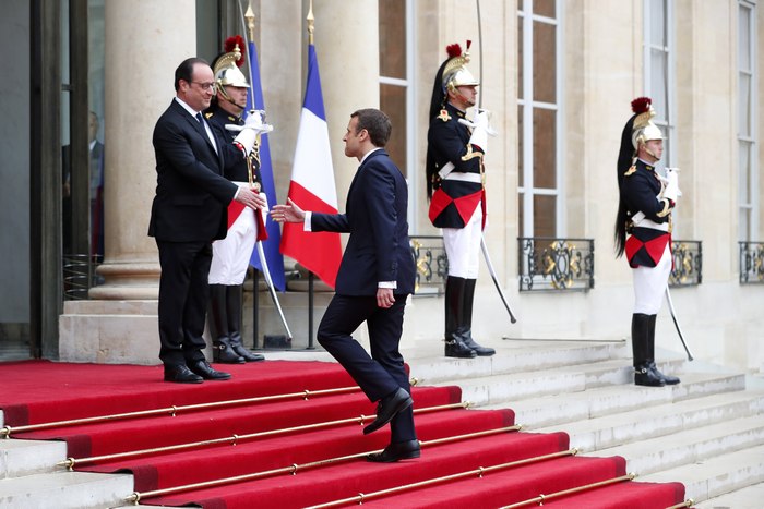 Макрон пристигна точно в 10 часа и 1 минута (11 часа и 1 минута българско време) пред централния вход на Елисейския дворец на ул."Фобур дьо Сен Оноре", където тълпа привърженици го приветства с френски и европейски знамена. Оланд посрещна приемника си на емблематичното стълбище в двора на двореца с почетен караул и оркестър и под звуците на церемониален марш.