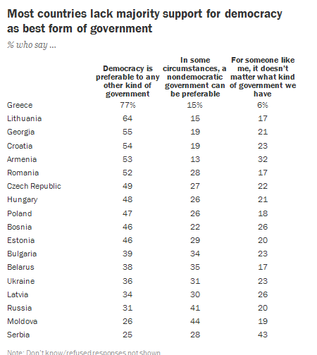 Но данните като цяло не са еднозначни. Солидни дялове от респондентите в много държави в Централна и Източна Европа - в това число около една трета от пълнолетните в България, Беларус, Русия и Молдова - смятат, че при определени обстоятелства за предпочитане е недемократично управление.