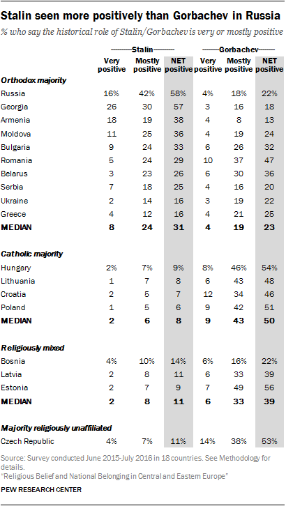 В Беларус, Румъния, Гърция, Украйна все пак нагласите са в полза на Горбачов. Подобна дилема не съществува в никоя от изследваните католически държави.