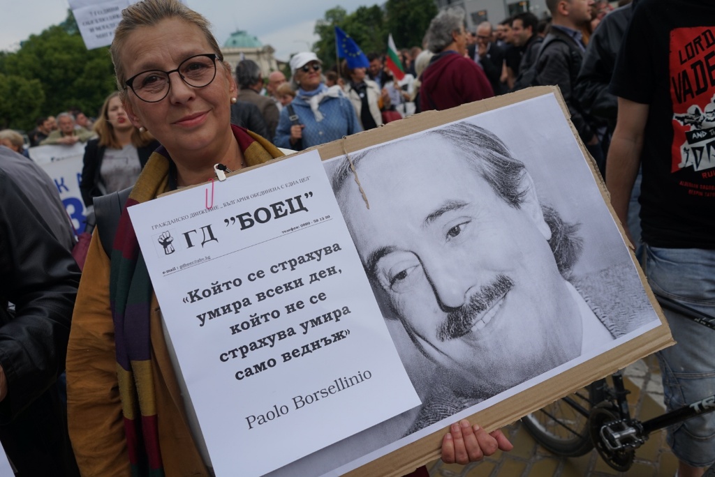 Има плакати "Още се питаме за четири години КОЙ" и цитати от италианския съдия-следовател Паоло Борселино, убит от мафията.