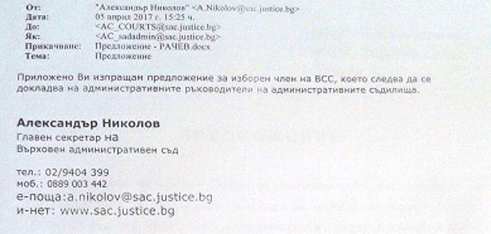 Става въпрос за публикация на "Медиапул", на която се вижда мейл от главния секретар на ВАС Александър Николов до административни ръководители на съдилища. В него точно преди изборите за новите 6 членове на съдийската квота се агитира за съдия от Габрово, бивш председател на административния съд, който сега е кандидат. Указанието е на официална бланка на ВАС.