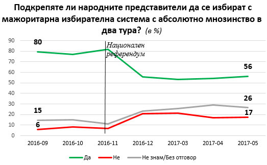 Делът на хората, които подкрепят идеята остава голям - над 50 на сто (56%), но е чувствително под нивата от около 80%, които се регистрираха преди националното допитване. Негативните отговори трайно са се увеличили– от 6% през есента до 17% преди месец. Явно развилата се след референдума кампания за пояснение на потенциалните негативи на мажоритарния вот е повлияла, коментират от социологическата агенция.