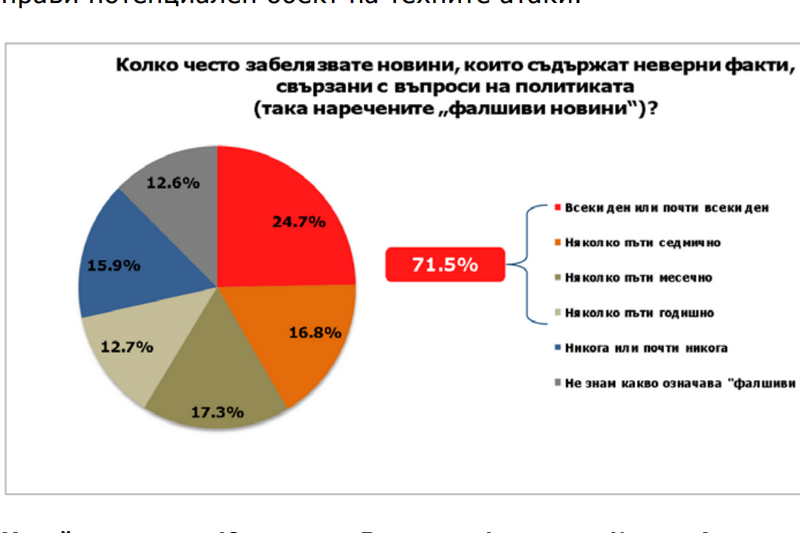 Всеки четвърти българин (25%) вижда всекидневно фалшиви новини в медиите, а всеки шести (17%) няколко пъти в седмицата, и още толкова – няколко пъти в месеца. Общо 72% са се натъквали на фалшива информация.
