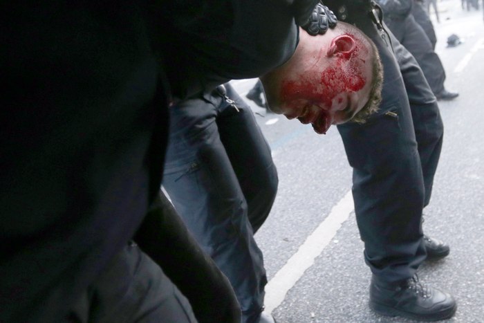 В демонстрацията, която е под надслов "Добре дошли в Ада", участват екстремисти и футболни агитки. Камъни, железни предмети и бутилки полетяха към ченгетата. Те отвърнаха с палки, сълзотворен газ и водни струи. Ранени са десетки и от двете страни. Арестувани са над 100 души.