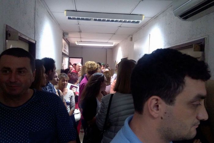 Сутрин ви посреща огромна опашка. Някои хора са се наредили още в 7 часа. Около 9,30 часа вече октавите на разговорите стават по-високи. Изнервени чиновнички зоват да се спазва редът, като се прочетат указанията. Да, ама те са в дъното на коридора, докъдето човек може да си пробие път в най-добрия случай за няколко минути.