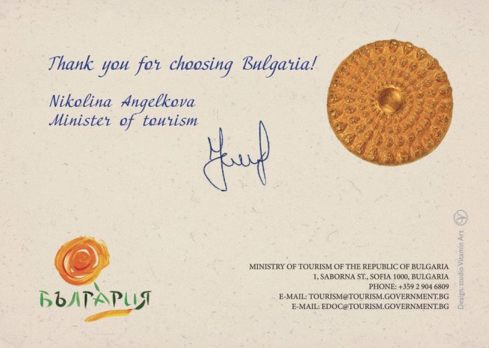 Те са подписани от министър Ангелкова и гласят на английски "Thank you for choosing Bulgaria" (пр. "Благодаря, че избрахте България").