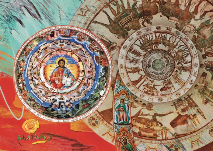 На лицевата част на картичката са изобразени стенописи от Рилския манастир и Тракийската казанлъшка гробница.