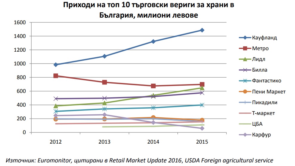 Данните на Euromonitor за 2016 г. показват, че около 13% от пазара на храни е концентриран в лидера „Кауфланд“.