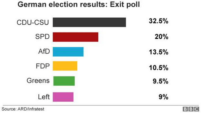 Християндемократическият съюз (ХДС) на германската канцлерка Ангела Меркел и баварският Християнсоциален съюз (ХСС) печелят 32,5 на сто от гласовете на парламентарните избори, предаде Би Би Си.