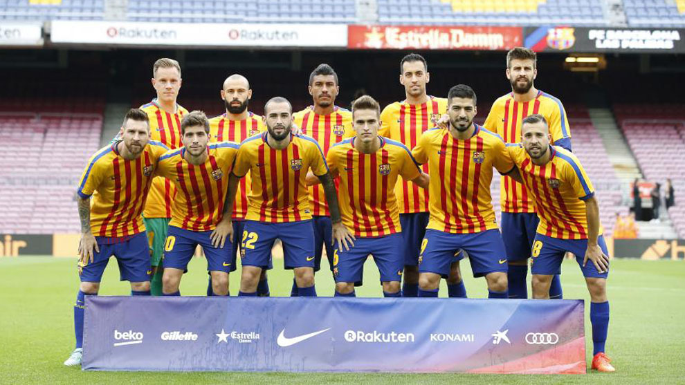 Футболистите излязоха да загряват преди мача с резервните си екипи. Те облякоха фланелки с жълти и червени райета, като флага на Каталуня. След това обаче те ги смениха с традиционния синьо-червен екип.