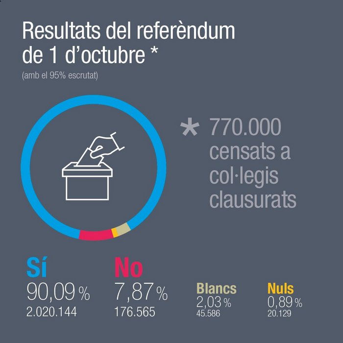 Тази сутрин регионалната управа на автономната област обяви, че 90 процента от гласувалите са казали "да" на отцепването от Испания. Подробната информация бе огласена от правителствения говорител Жорди Туруй и публикувана в туитър.