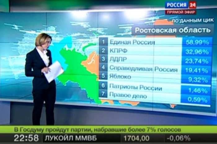 Рекордът обаче е от парламентарните избори в Русия през декември 2011 г. Тогава държавната телевизия "Россия 24" показа таблица, според която в Ростовска област са гласували 146 процента.