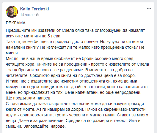 Начинанието на издателството да продадат всички наличности от книгите на Калин Терзийски не остана без коментар от самия него. Писателят публикува статус по темата, озаглавен „Реклама“. В него той подчертава, че намалените книги не са преоценена стока, въпреки че може би ситуацията изглежда такава. Терзийски обяснява, че книгите се предлагат с намалена цена, за да „изчистят отношенията си със „Сиела“, а предлагането на книги на достъпна цена винаги е за добро. Авторът съобщава, че „Сиела“ притежават 7000 тома от 20 заглавия, „написани от мен, но принадлежат на тях“.