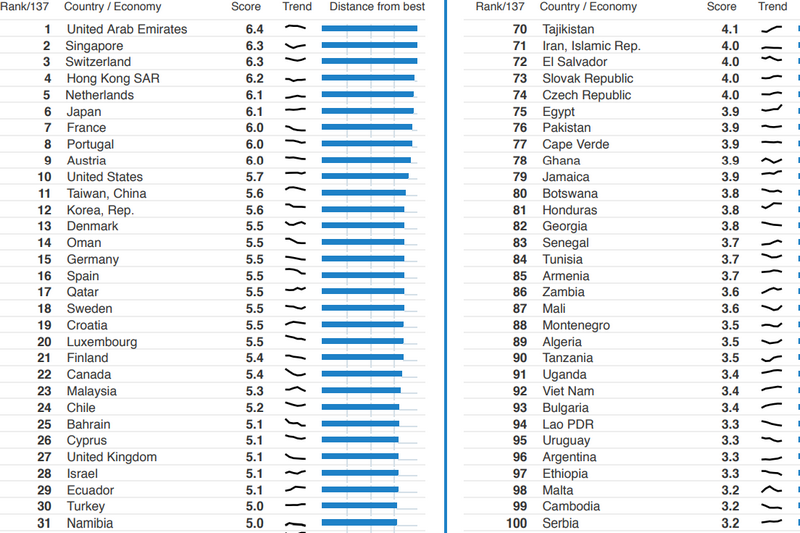 В рейтинга попадат общо 137 държави, като челната тройка се попълва от Обединените арабски емирства, Сингапур и Швейцария.