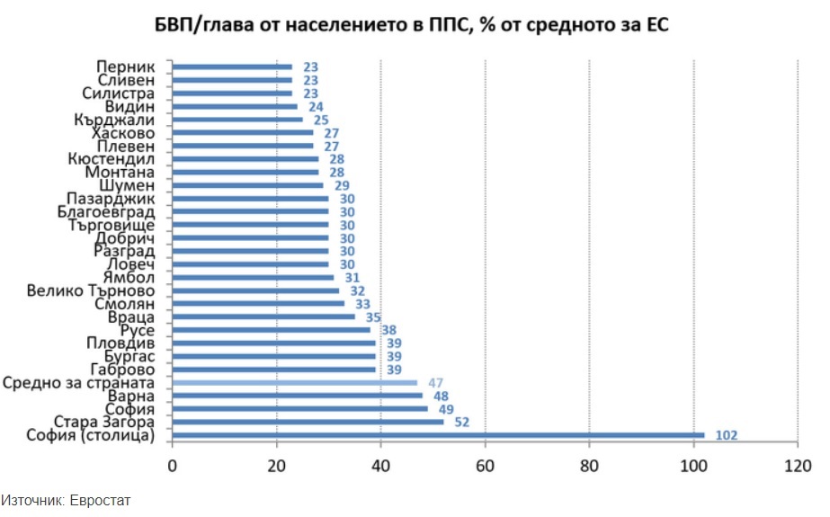 Огромната пропаст в стандарта на живот между отделните области на страната, обаче, продължава да се отваря. Така например, най-бедните области в България през 2006 г. (в сравнителен план спрямо средното в ЕС) са на ниво 22% от средните доходи за ЕС – Видин, Силистра, Сливен и Ямбол. Най-богатата тогава област отново е столицата с БВП/глава, равно на 80% от средното за съюза. Т.е. тогава разликата между най-бедните и най-богатата област е почти 4 пъти в средните доходи, измерени в БВП/глава в СПС. През 2015 г. тази разлика вече е близо пет пъти, тъй като най-бедните области са на ниво от 23% от средното за ЕС (Силистра, Сливен и Перник), а София достига 102%. Разрастването на разликата между София и най-бедните области се отчита и през 2015 г. спрямо 2014 г., когато София е на ниво 100% от ЕС-28, а най-слабо развитата област в страната (Силистра) отново е на 23%.