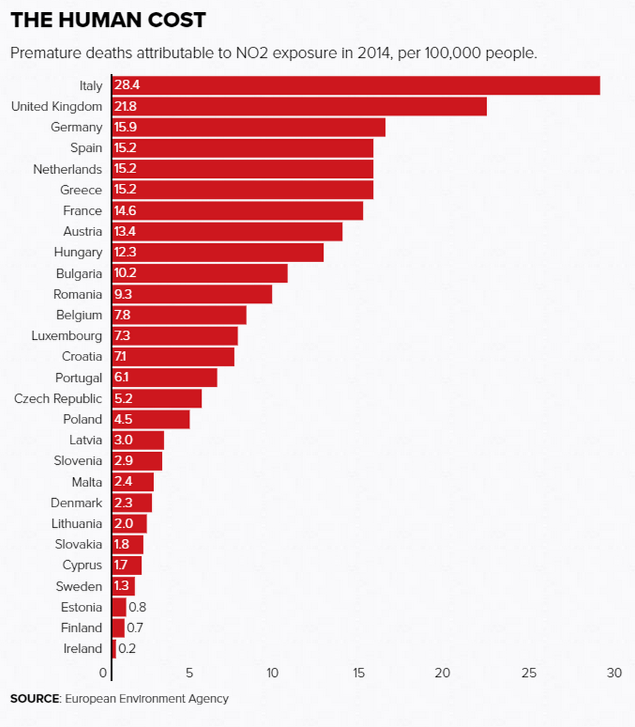 Още по-мрачна изглежда ситуацията със специфичните замърсители на въздуха. През 2014 г. 75 000 европейци са починали от преждевременна смърт заради азотния диоксид, който се произвежда от дизеловите автомобили. В България 10.2 на 100 000 души губят живота се заради него, с което се нареждаме на десето място в ЕС.