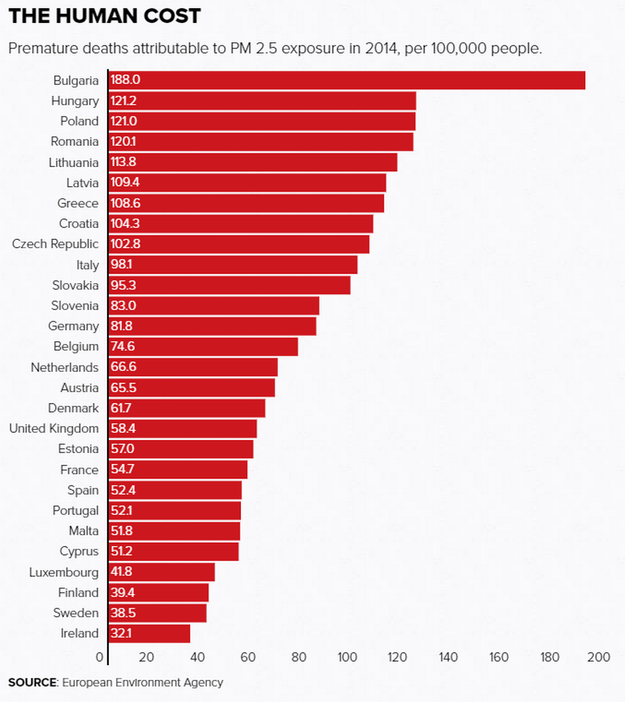 На второ и трето място след България по смъртност заради замърсения въздух са Унгария и Полша, където повече от една трета от населението се отоплява на въглища. Това е основният източник на замърсяване, следван от превозните средства и индустрията.