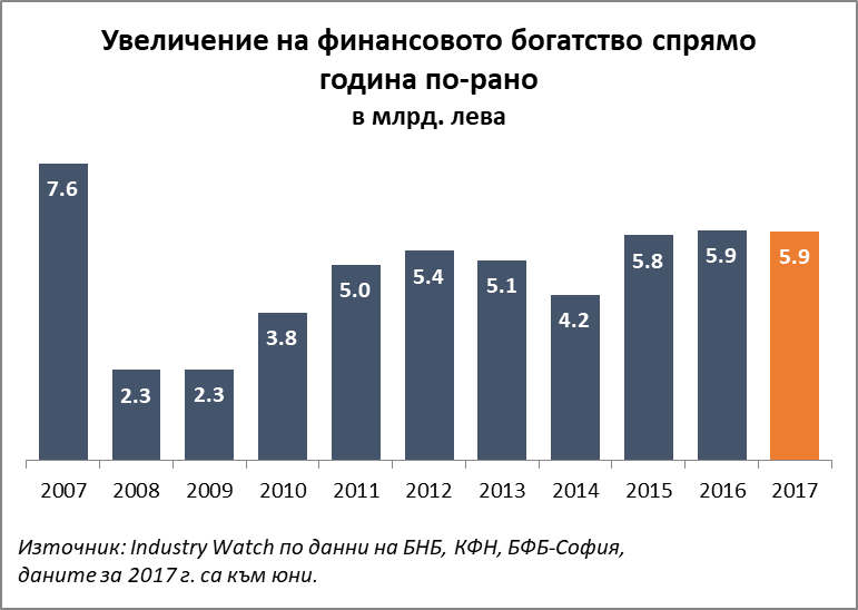 Финансовото богатство на българските домакинства се увеличава с 5.9 млрд. лева през последните 12 месеца, достигайки 73 млрд. лева към юни 2017 г. Богатството през последните три години нараства най-съществено от десетилетие насам, но още изостава от темповете на растеж през върховата 2007 г., съобщи "Индъстри уоч".
