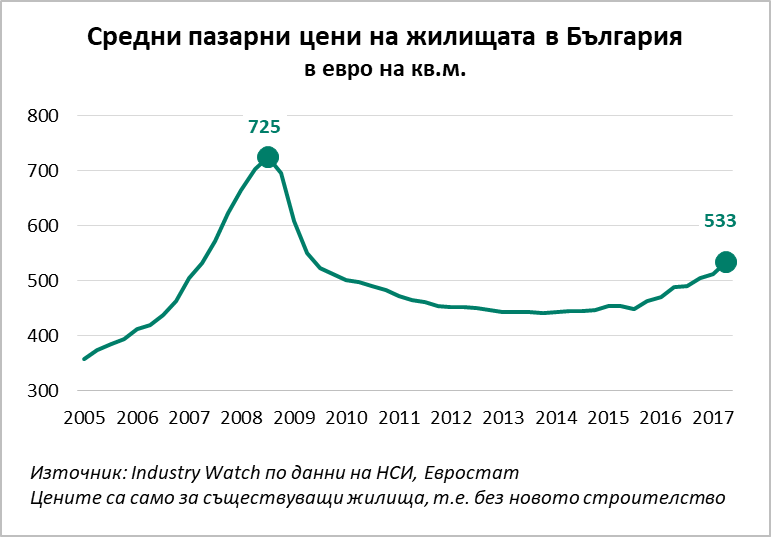 Пазарните цени на жилищата нарастват с 8.6% годишно през второто тримесечие на 2017 г., а от дъното на пазара през 2013 г. досега апартаментите са поскъпнали с 21% по данни на НСИ. По този начин средната цена на кв. м. жилищна площ в страната (без новото строителство) достига 533 евро в средата на 2017 г.