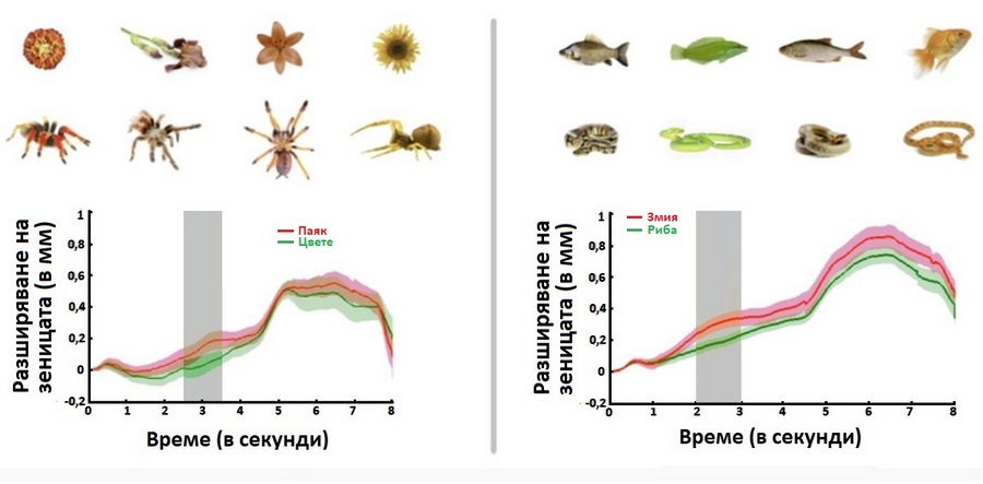 Изображенията на „безопасните“ и „опасните“ предмети били показвани на децата последователно. На графиката по-долу се виждат средните показатели на реакцията на зениците при вида на безопасен предмет (зелена линия) и опасен (червена линия). Казано накратко: зениците на бебетата се разширяват повече при вида на паяци и змии.