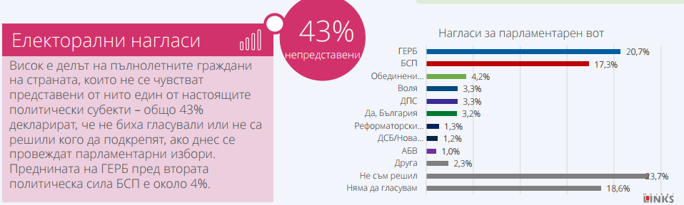 • Висок е делът на пълнолетните граждани на страната, които не се чувстват представени от нито един от настоящите политически субекти – общо 43% декларират, че не биха гласували или не са решили кого да подкрепят, ако днес се провеждат парламентарни избори.