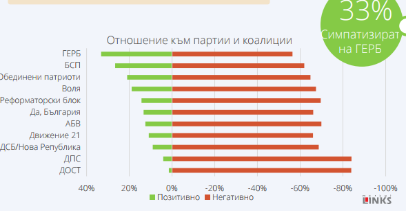 Всички политически сили са с подчертано отрицателен баланс между позитивните и негативните оценки. Преднината на ГЕРБ пред втората политическа сила БСП е около 4%. Към настоящия момент ГЕРБ може да разчита на 21% от гласоподавателите, но електоралният таван на партията е значително по-висок, тъй като около 33% декларират, че имат положително отношение към управляващата политическа сила.