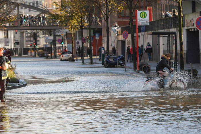 Няколко линии на железопътната компания "Дойче бан" в същия регион на страната са били прекъснати, а част от улиците в пристанището Хамбург са били наводнени.