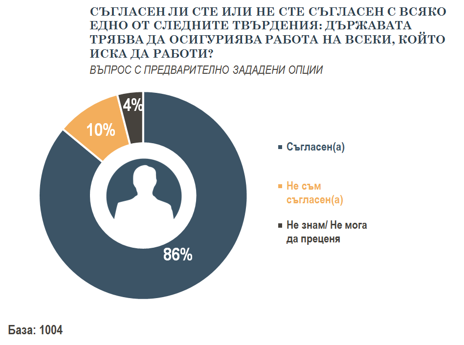По отношение на ролята на държавата имат превес по-скоро етатистки нагласи, или нагласи, останали от предишния режим. Така огромното мнозинство смята, че образованието и здравеопазването трябва да са напълно безплатни, а държавата трябва да осигурява работа на всеки, който иска да се труди.