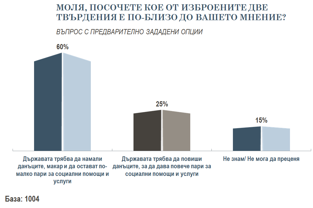 Парадоксално обаче, хем образованието и здравеопазването трябва да са безплатни, хем данъците не бива да се увеличават. 60 на сто твърдят, че държавата трябва да намали данъците, макар да остават така по-малко пари за социални дейности. Много по-нищожен е процентът на анкетираните - една четвърт, които смятат, че данъците трябва да бъдат увеличени.
