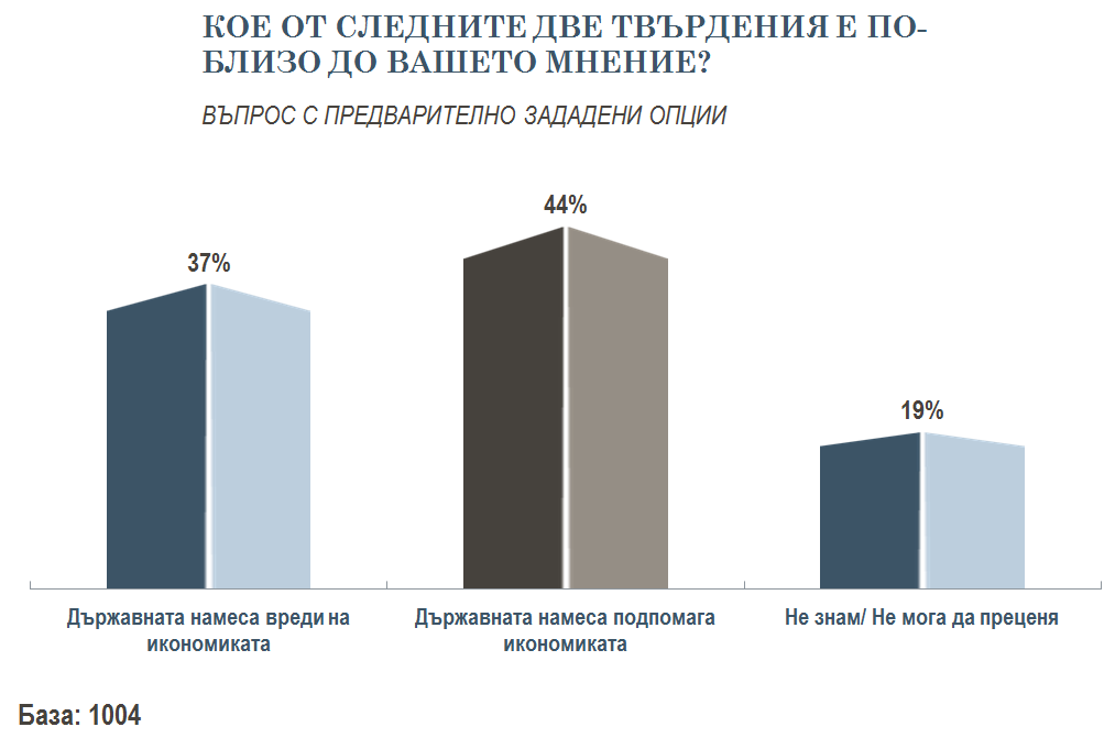 Същевременно 44 на сто смятат, че държавната намеса помага на икономиката. И това е преобладаващото мнение, сочат данните. Според 37 на сто е вярно обратното твърдение - че държавата вреди на икономиката.
