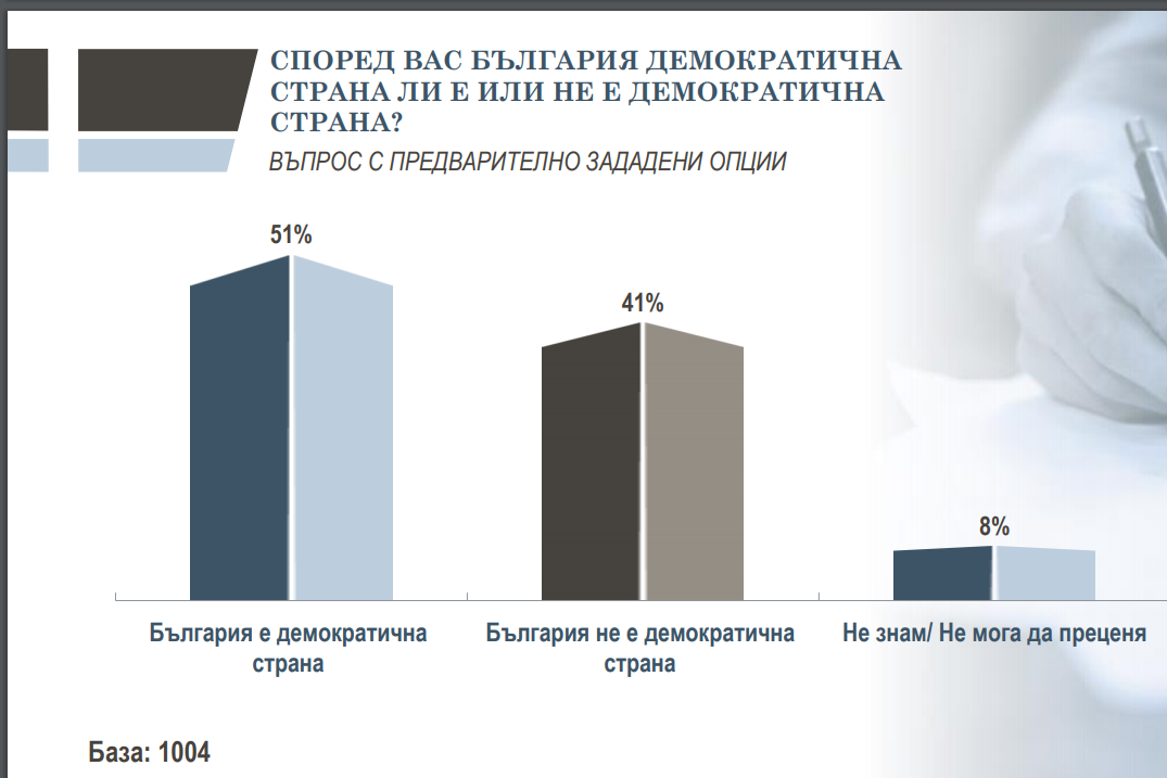 Малко повече от половината от българските граждани смятат, че България е демократична страна, докато 41% са на обратното мнение. Това сочат данните от национално представително изследване на агенция "Тренд"*, посветено на ценностните нагласи на българите.