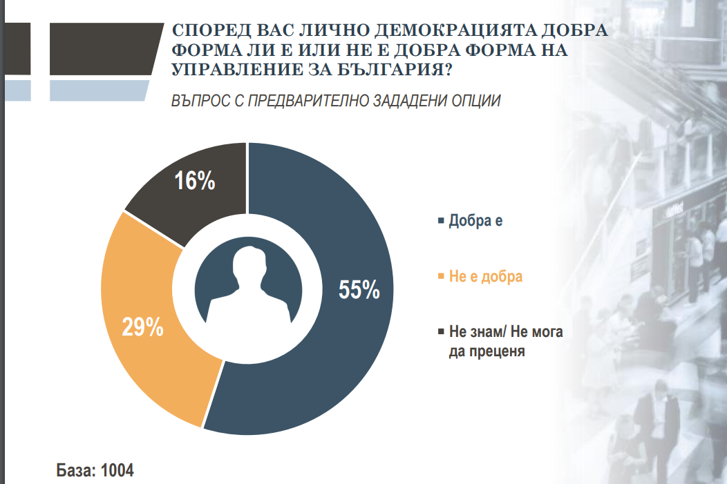 Мнозинството от българите - 55%, смятат, че демокрацията е добра форма на управление за България, докато 29% са на обратното мнение. Тук отново личат подобни демографски зависимости сред най-младите и живеещите в столицата, отбелязват от "Тренд".