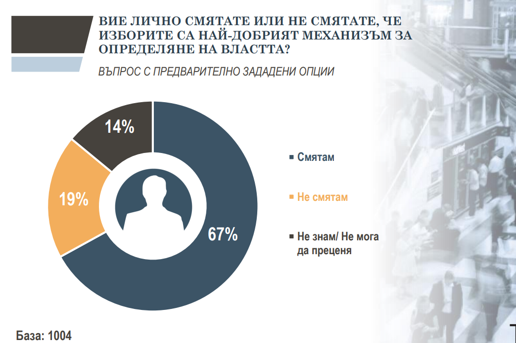 Все пак изборите остават предпочитан механизъм за определяне на властта. На това мнение са две трети от анкетираните. Близо една пета е на противоположното мнение - 19 на сто отговарят, че изборите на се най-добрият начин за опеделяне на властта.