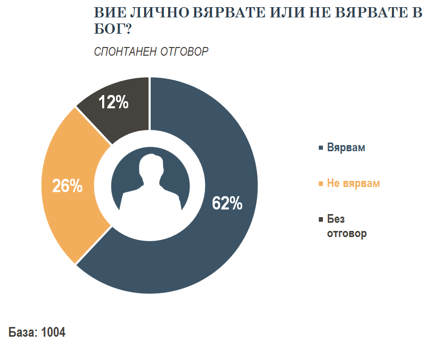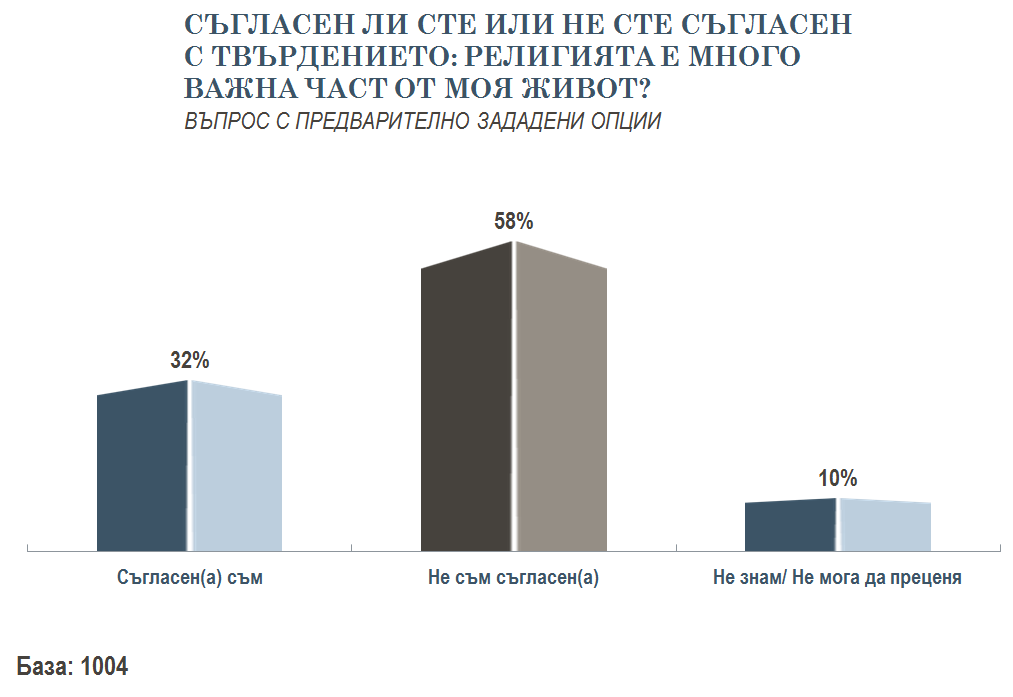 Едва 32 на сто от анкетираните твърдят, че религията е много важна част от техния живот. Въпреки че 62 на сто обявяват, че вярват в Бог. Малко над една четвърт от българите заявяват, че са атеисти. Липсва разрез за отговорите на този въпрос по различни религии, които се изповядват в България, така че не може да се види има ли връзка между отделното вероизповедание и степента на декларирана религиозност.