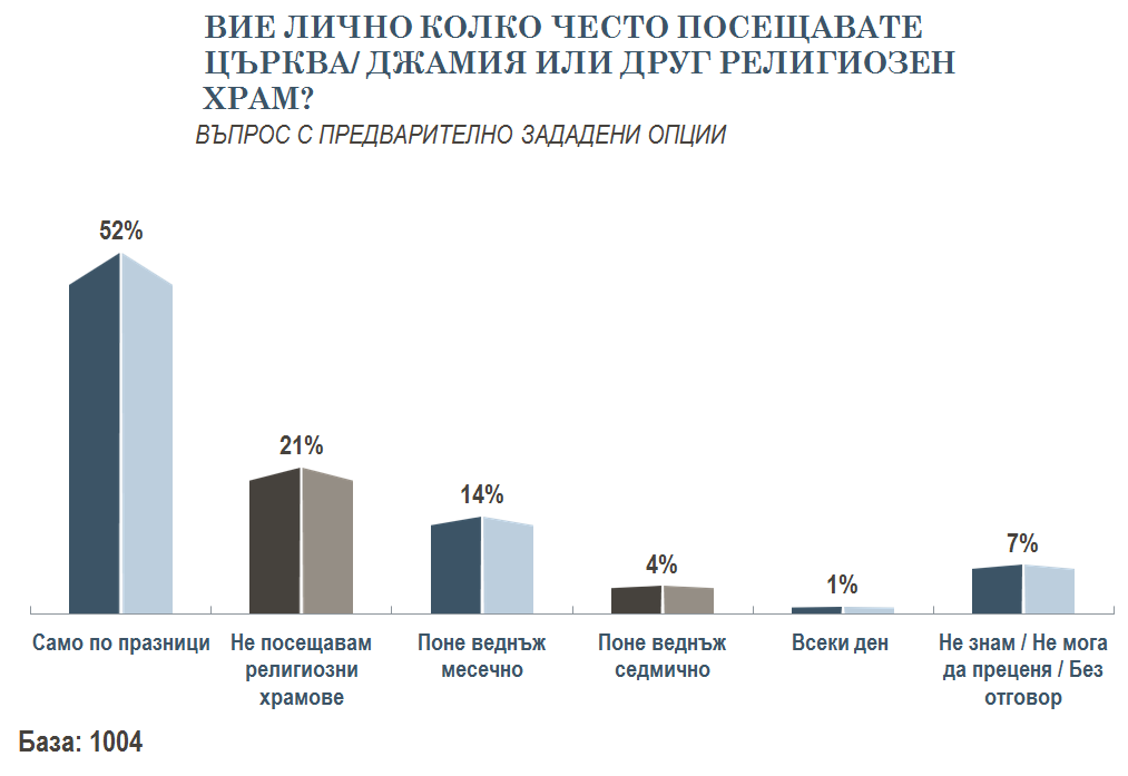 21 на сто от хората обявяват, че не посещават религиозни храмове, а големият процент влиза в тях само по празници. Едва 4 на сто ходят всяка седмица.
