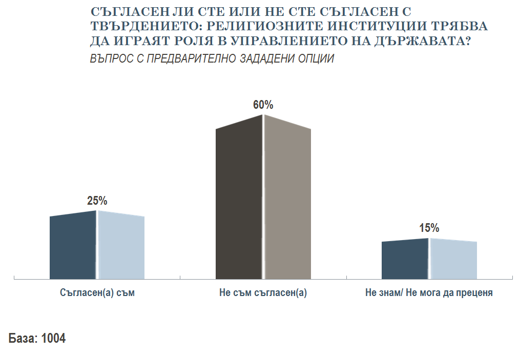 Светският характер на държавата не се подлага на съмнение, като 60% от всички запитани не са съгласни религиозните институции да играят роля в управлението на държавата. Една четвърт са на обратното мнение. Тук отново отчитаме динамика при различните демографски групи, като живеещите в столицата са най-скептични към по-сериозната роля на църквата в държавните дела, докато една трета от живеещите в селата подкрепят това. Въпреки различията, във всички демографски групи преобладава несъгласието църквата да играе роля в управлението на държавата.
