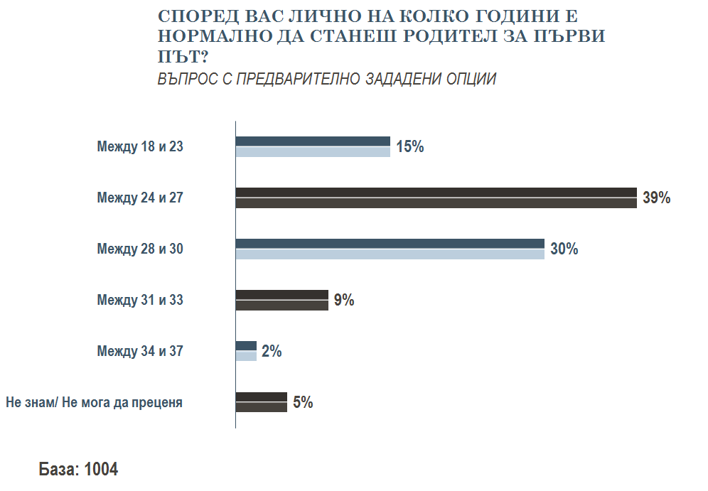 Средната възраст на жените при раждане на първо дете се увеличава от 26.9 години през 2015 г. на 27.0 години през 2016 година, сочат данните на Националния статистически институт. Според отговорите на анкетираните мнозинството от българите - 39 на сто смятат, че е нормално да станеш родител за първи път между 24 и 27 години. 30 на сто твърдят, че това е добре да стане между 28 и 30 години.