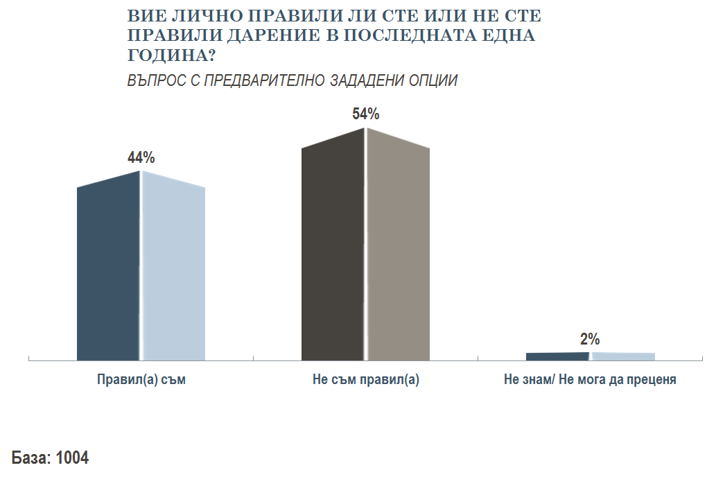 Българите не могат да се определят като много въодушевени дарители, поне според отговорите им от изследването. Преобладаващото мнозинство - над 54 на сто, отговарят, че не са правили дарение през последната година. Предпочитаният начин си остава изпращането на SMS - за 35 на сто от анкетираните.