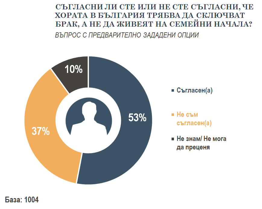 Според българина семейството е най-голяма ценност, както е отчетено в изследването на "Тренд". Поне на теория. 53 на сто смятат, че хората трябва да сключват брак. За живот на семейни начала се обявяват 37 на сто от анкетираните.