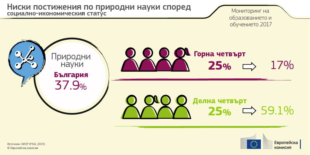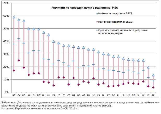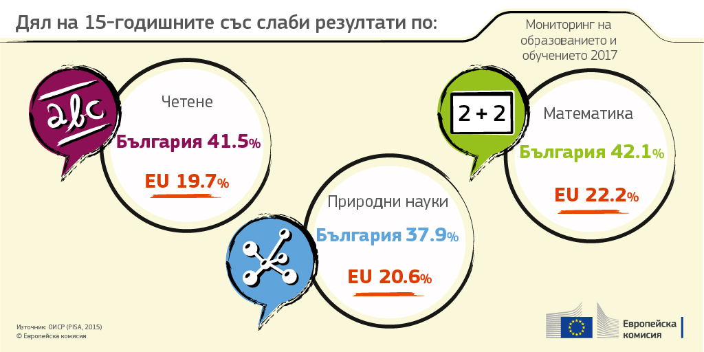 През 2015 г. ниските резултати в България са около два пъти повече спрямо средните резултати за ЕС: 37,9 % спрямо 20,6 % по природни науки, 41,5 % спрямо 19,7 % по четене и 42,1 % спрямо 22,2 % по математика (ОИСР, 2016 г.).