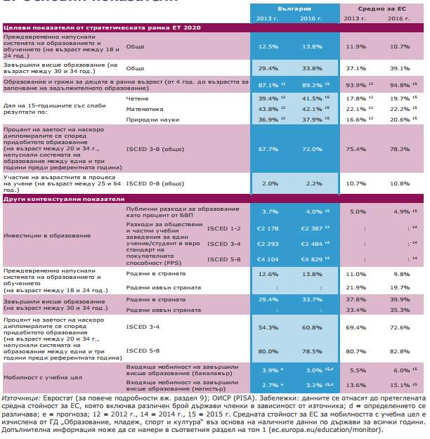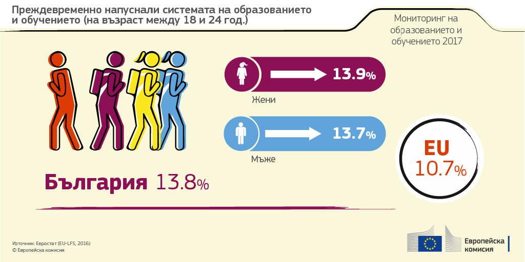 Обратно на общата тенденция в ЕС, делът на преждевременно напускащите училище (на възраст 18 - 24 години) се увеличава: 13,8 % през 2016 г. в сравнение с 10,7 % средно за ЕС. В този контекст ще се окаже трудно да бъде постигната националната цел от 11 %, заложена в стратегията „Европа 2020“, пише в доклада.