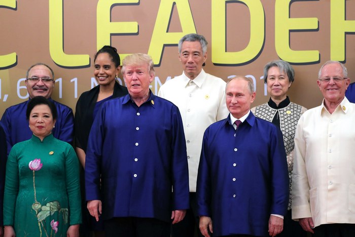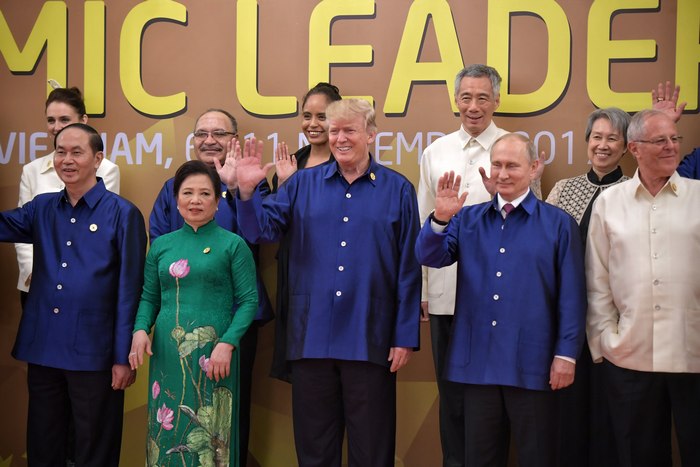 Путин и Тръмп се срещнаха, докато лидерите пристигаха един след друг за снимки във виетнамски национални костюми и носии. Руският президент застана на подиума малко по-рано от американския си колега. Двамата си стиснаха ръцете, след което Тръмп дружески потупа Путин по рамото в продължение на 4 секунди. Те застанаха един до друг и размениха няколко фрази.
