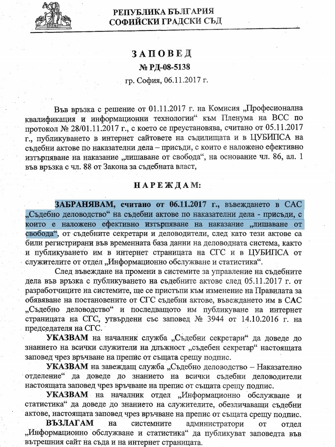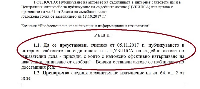 Явно на базата на това, на свое заседание на 1 ноември Комисия "Професионална квалификация и информационни технологии" към пленума на ВСС пъргаво постановява, че от 5 ноември се преустановява публикуването в интернет сайтовете на съдилищата и в централния регистър ЦУБИПСА на съдебни актове по наказателни дела - присъди, с които е наложено ефективно изтърпяване на наказания „лишаване от свобода“. Дума няма да е само за ВКС: