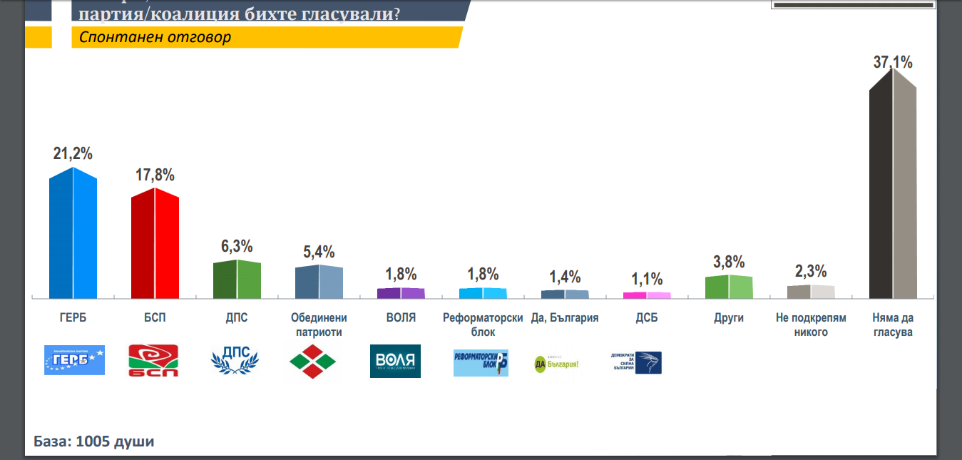 ГЕРБ запазва първата си позиция с 21,2% от всички анкетирани, подкрепата за БСП е 17,8%. Острото противопоставяне между двете основни партии води до консолидация и мобилизация на техните електорати, коментират от "Тренд".